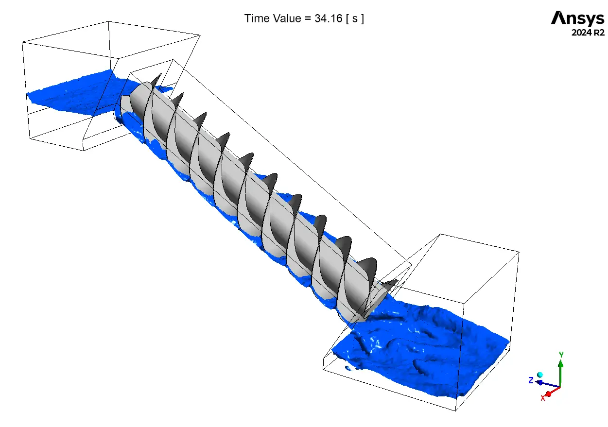 Inside ANSYS Fluent, the physics were set up to handle the complex motion. The VOF (Volume of Fluid) model was used to track the water and air. This is essential because the screw is an “open channel” device where the water level changes constantly. The most critical part was the 6DOF solver. The engineer told Fluent the weight and inertia of the screw, and the software calculated the rotation based on the water pressure. To handle this rotation, Dynamic Mesh was activated with smoothing and remeshing methods. This ensures that as the screw turns, the mesh cells stretch and rebuild themselves to stay high quality. The simulation was transient, meaning it calculated the flow step-by-step over time to show the startup and steady operation of the turbine.