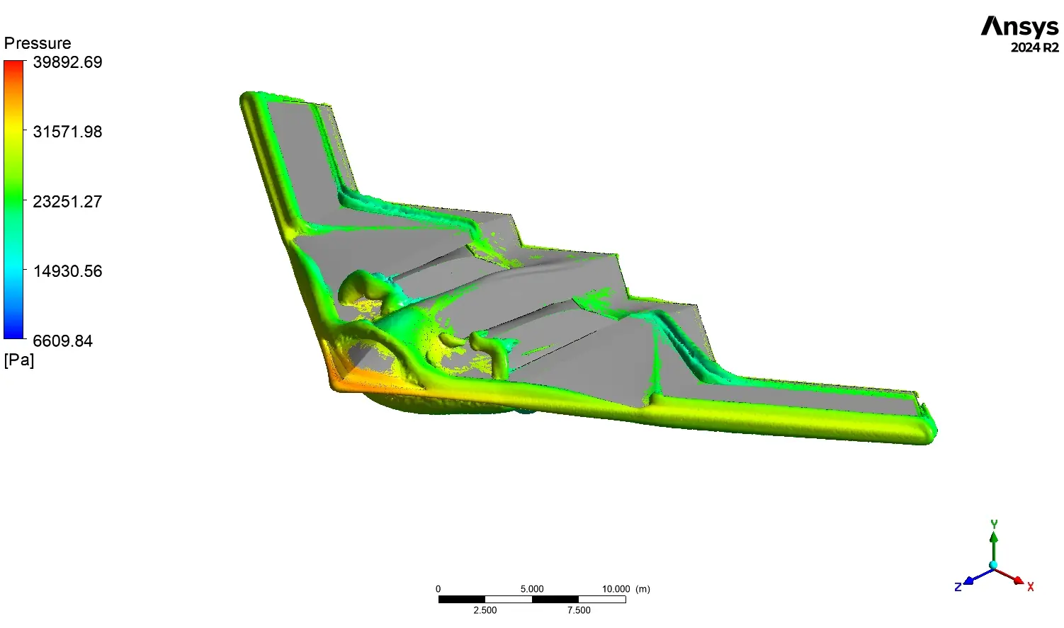 The simulation results provide a complete engineering story, revealing the complex balance of forces that allows the B-2 to fly effectively while maintaining its stealth characteristics. From an engineering viewpoint, the analysis begins with how the aircraft generates lift. The pressure gradient contours in Figure 3 clearly show a region of very high pressure on the front leading edges, with a maximum value of 39,892 Pa. This is the stagnation point, where the air directly impacts the aircraft. The contours also show large areas of low pressure across the upper surfaces. It is this pressure difference between the high-pressure bottom and low-pressure top that generates the necessary lift. However, this pressure also creates a significant drag force that the engines must overcome.