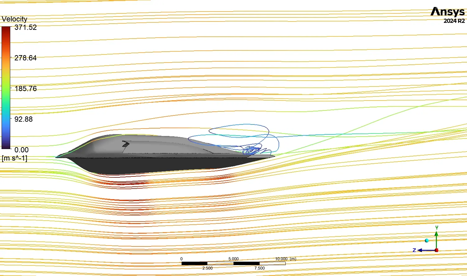The most important achievement of this simulation is the successful capture and visualization of these localized shock waves. For a stealth aircraft designer, this is the most important challenge to solve. Shock waves are a major source of aerodynamic drag (called wave drag) and, even more critically, they can create a very large radar reflection, compromising the aircraft’s stealth. This B2 Aerodynamics fluent analysis gives designers the precise information they need: it shows them exactly where these shock waves form and how strong they are. This allows them to make tiny, millimeter-level changes to the aircraft’s shape to minimize the strength of these shocks, thereby balancing the need for lift against the absolute requirement for minimum drag and maximum stealth.