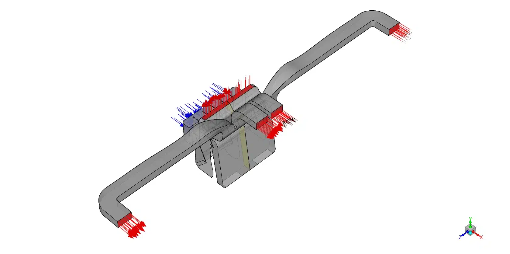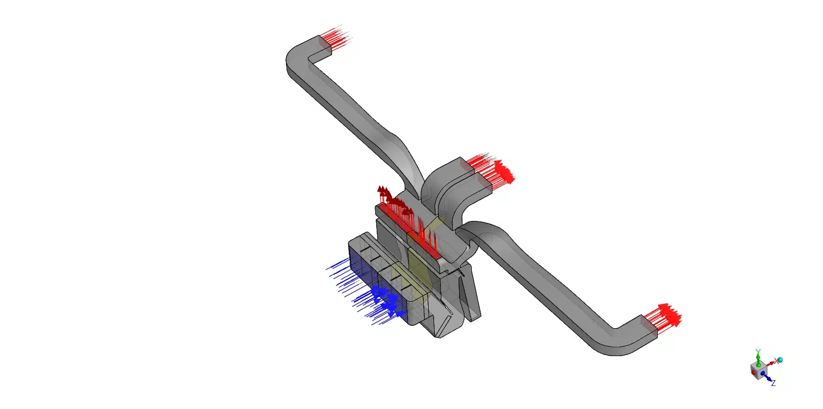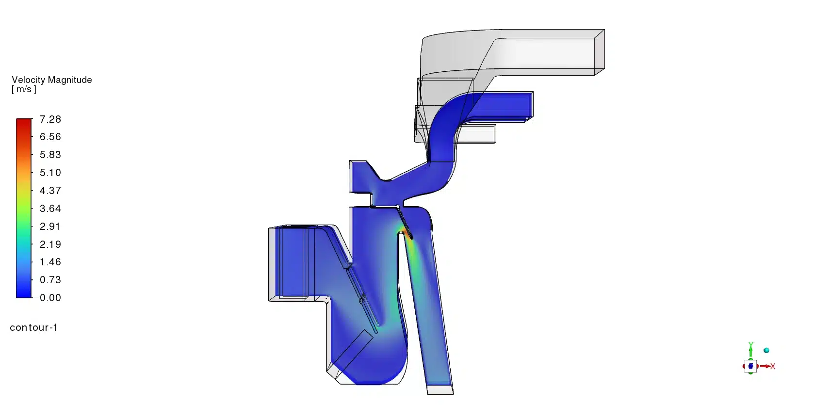 When we combine the severe thermal stratification from the visual contours with the extreme flow imbalance from the data table, the engineering conclusion becomes perfectly clear. This specific duct design provides terrible passenger thermal comfort. Because of the thermal separation and flow imbalance, a driver might feel a harsh, strong blast of cold air at their feet, while their face receives almost zero warm airflow. To optimize this computational representation, mechanical engineers must place physical mixing baffles inside the central chamber. These baffles will force the blue and red air to crash together and blend completely. Furthermore, engineers must reduce the physical diameter of the foot tubes to increase resistance, while widening the side tubes to reduce pressure drop. These simple geometric changes will balance the physical airflow and deliver perfectly mixed, comfortable air to every single passenger in the vehicle.