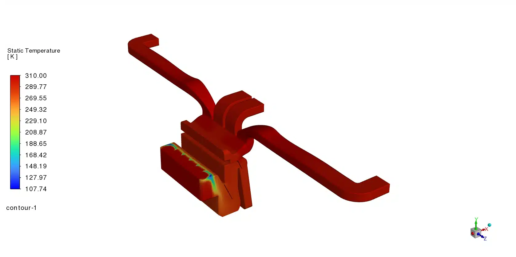 To evaluate the true engineering performance of this climate control design, we must deeply analyze the mathematical velocity data and the visual temperature contours together. The attached temperature contours reveal exactly how the climate control unit mixes the hot and cold air. Inside the central chamber, we observe a distinct and problematic separation of thermal energy. The contour displays deep blue zones representing the very cold incoming air at 273.00 K. Simultaneously, we see dark red zones representing the hot air heated to 310.00 K. Instead of blending into a uniform, comfortable green color, the two air streams separate heavily. This physical event is called thermal stratification. The hot 310 K air naturally rises and fills the upper plastic tubes, turning them bright orange (around 300 K to 306 K). Conversely, the heavier cold air falls toward the bottom sections, creating light green and blue zones (around 280 K to 290 K). This uneven temperature distribution is a severe engineering failure because it means different vents will blow air at completely different temperatures into the cabin.