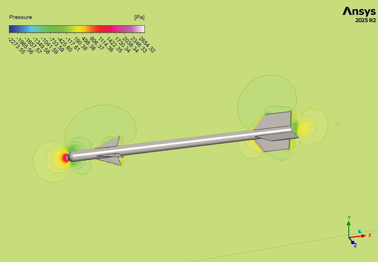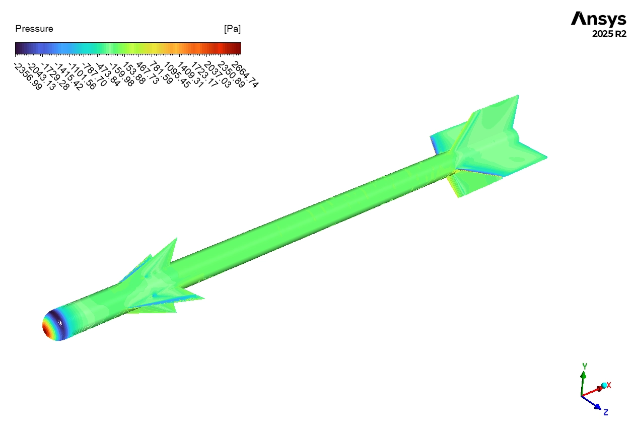 To evaluate the flight performance of this vehicle, we must analyze the exact force data and the flow contours generated by the ANSYS Fluent. This scientific analysis explains exactly how the solid body interacts with the fast air. The post-processing data provides the primary aerodynamic force parameters. The software calculated the exact value for the lift coefficient (Cl) as 2.1613691. At the same time, the computer calculated the drag coefficient (Cd) as 0.85141414. These coefficients are non-dimensional numbers that represent the total upward pushing power and the total backward resistance of the vehicle. A lift coefficient of 2.16 is a very high number. It indicates that the missile is flying at a high angle of attack. At this steep angle, the bottom surfaces of the missile push heavily against the incoming air.