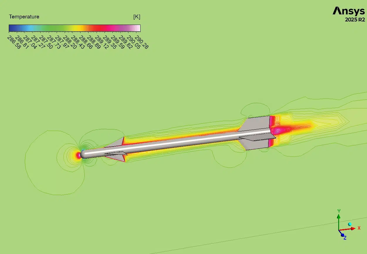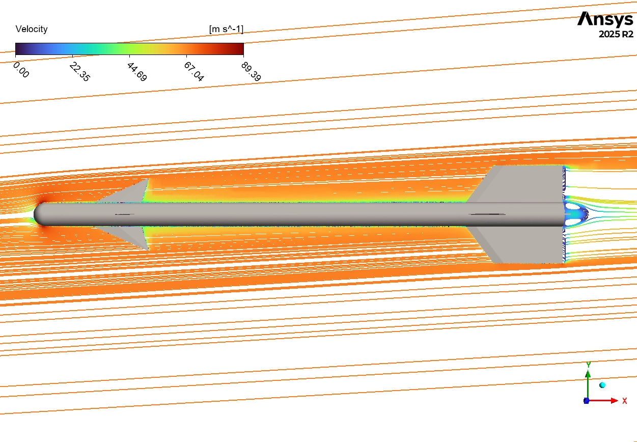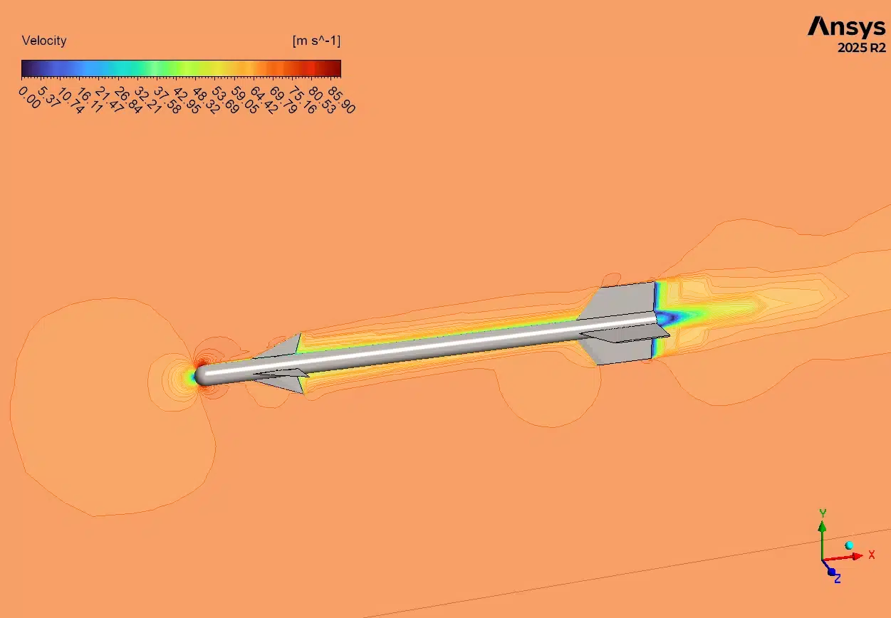 Figure 3: Velocity contour from ANSYS Fluent canard missile, visualizing the different speeds of air around the body and the slow air hiding behind the fins.