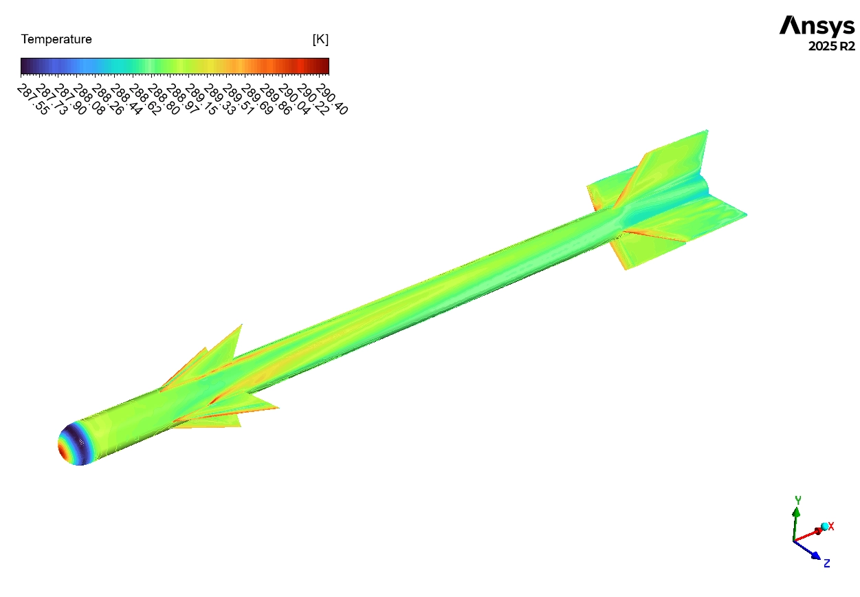 Finally, we study the wall shear stress contour to locate regions of high skin friction. As the missile travels forward, the air rubs violently against the solid metal. The contour shows distinct red and orange zones directly on the sharp leading edges of the forward canards and the rear tail fins. These sharp edges cut through the stationary air, creating very high local friction forces. This skin friction adds an extra layer of resistance to the total drag. By understanding these exact fluid events—the high-pressure lifting zones, the energy-draining tip vortices, and the friction on the sharp edges—aerospace engineers can confidently modify the canard design to improve stability and speed.
