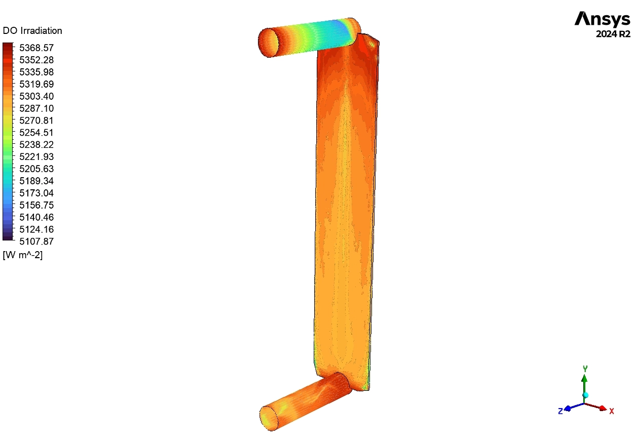 Finally, we look at the Radiation Heat Flux in Figure 4. The contour shows values around 5368 W/m² at the top. The top is Red because the oil is hottest there, and radiation depends on temperature. This proves that the DO Radiation Model is working correctly. However, even with radiation, the cooling is not enough. This Transformer Radiator Cooling CFD analysis proves that the designer needs to either lower the pump speed (to increase residence time) or add fins to the radiator to increase the surface area.