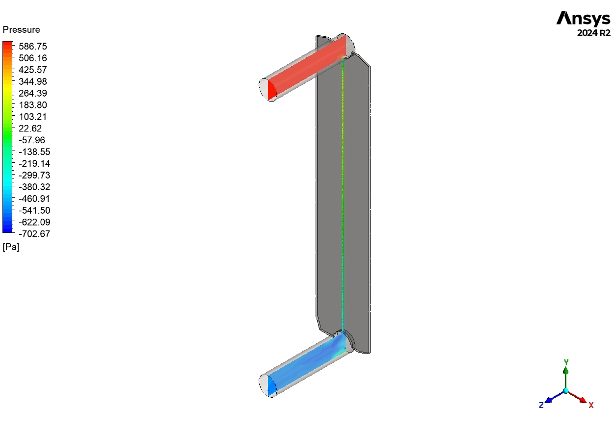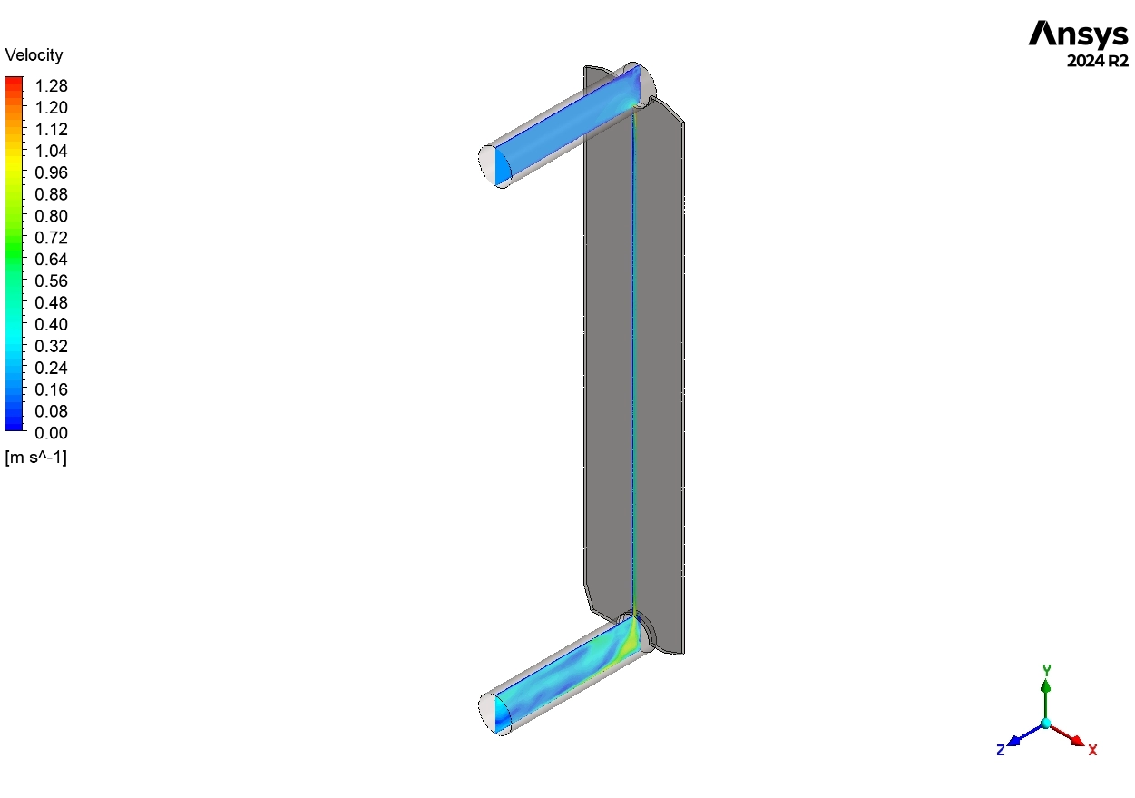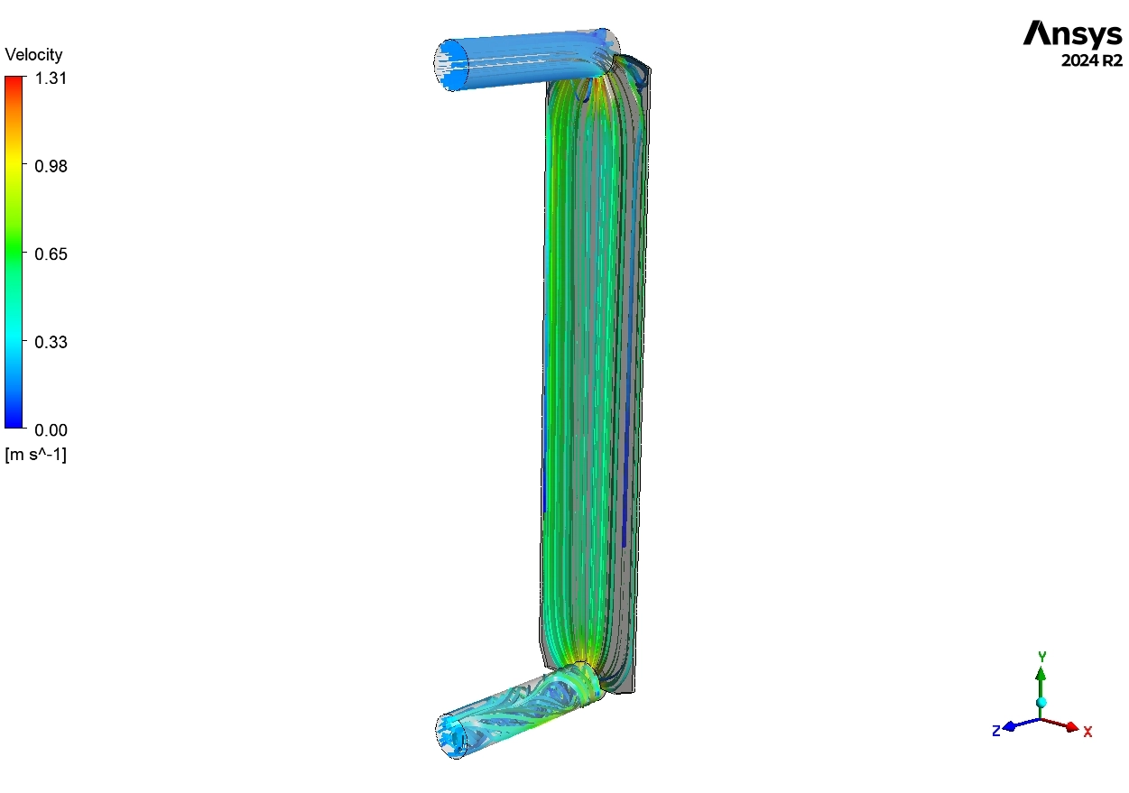 Next, we examine the Velocity Field in Figure 5. The maximum velocity is 1.31 m/s at the inlet pipe. Inside the panel, the speed settles around 0.5 – 0.7 m/s. This confirms our diagnosis. In a cooling system, we usually want slower flow to allow better heat transfer. This high speed explains why the temperature drop was only 0.33°C. The variable viscosity did not slow the flow enough to make a difference because the pump pressure was too strong.