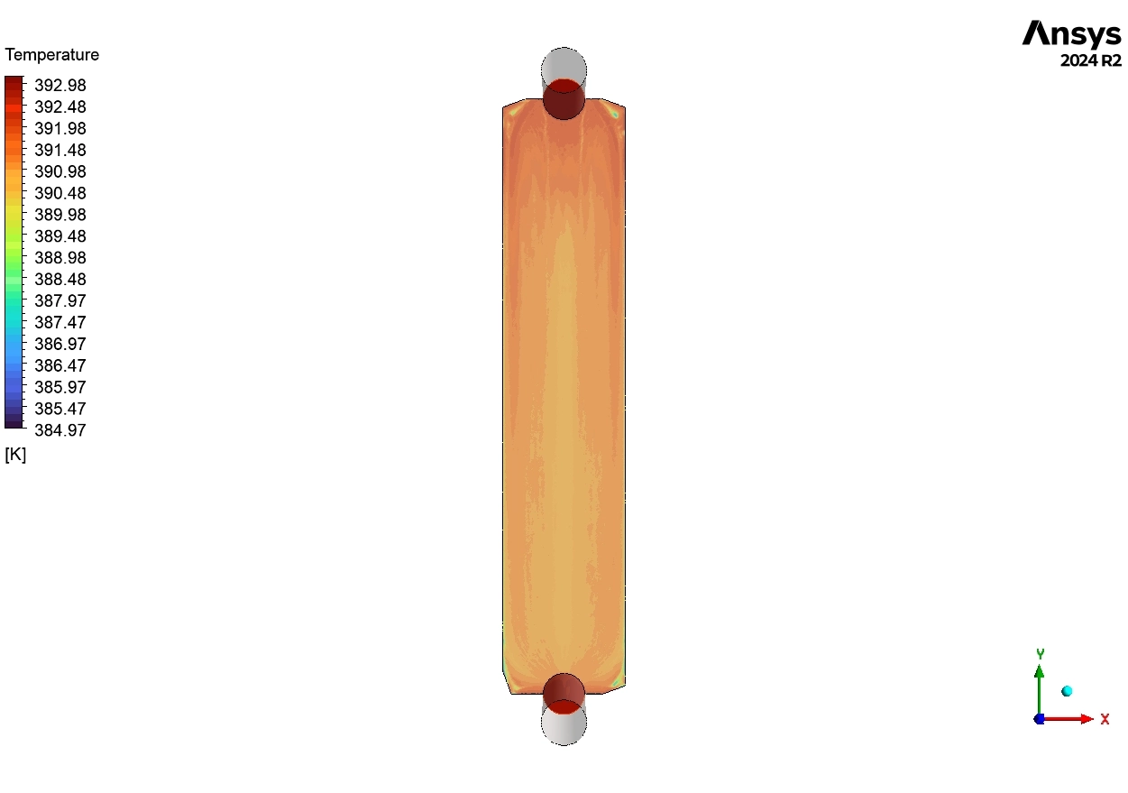 This section analyzes the engineering data to evaluate the Transformer Radiator Cooling CFD results. We interpret the contours to help designers improve the system. First, we analyze the Temperature Streamlines in Figure 3. The oil enters at the top at 120°C. As it flows down, the color changes very slightly. The average Outlet Temperature is 119.67°C. This means the temperature drop is only 0.33°C. From an engineering perspective, this is a poor result. It indicates that the 0.61 m/s inlet velocity is too high. The oil rushes through the radiator so fast that it does not have enough “residence time” to release its heat to the air.