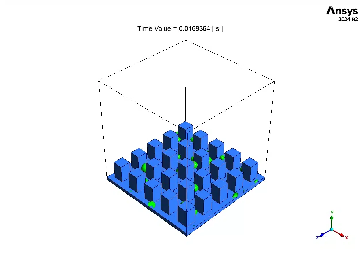 - The Catch (0.016s): First, look at the small green spheres. These are the newborn water droplets. They only form on the flat ground between the pillars because we programmed that area with a 30-degree water-loving angle.