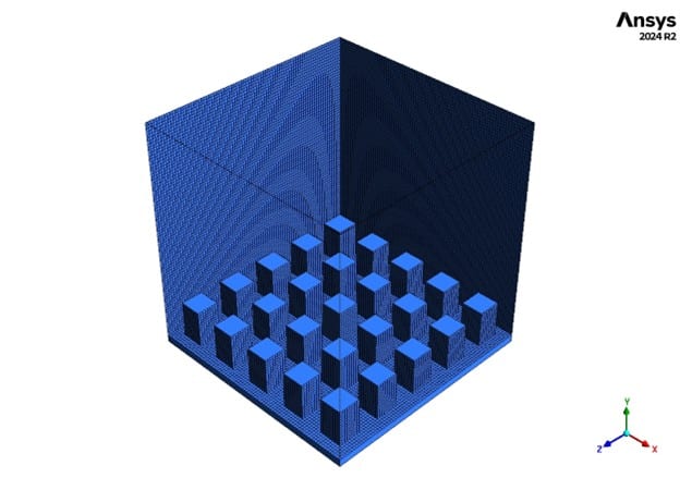To build this Condensation on Microstructured Surface ANSYS Fluent project, we created a 3D grid of microscopic pillars using ICEM CFD software. Because water droplets are incredibly small, we used a highly refined structured mesh containing exactly 512,000 cells. We packed the smallest cells right around the edges of the pillars to catch the exact moment a water drop is born.