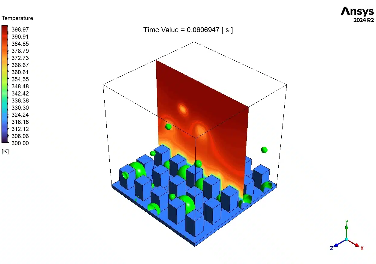 The most important part is the yellow transition zone (330 K to 360 K) wrapping right around the droplets. This yellow halo is the exact physical location where “Latent Heat” is being released. It proves visually that as the hot vapor touches the cold droplet, the vapor loses its energy, changes shape, and becomes liquid water.