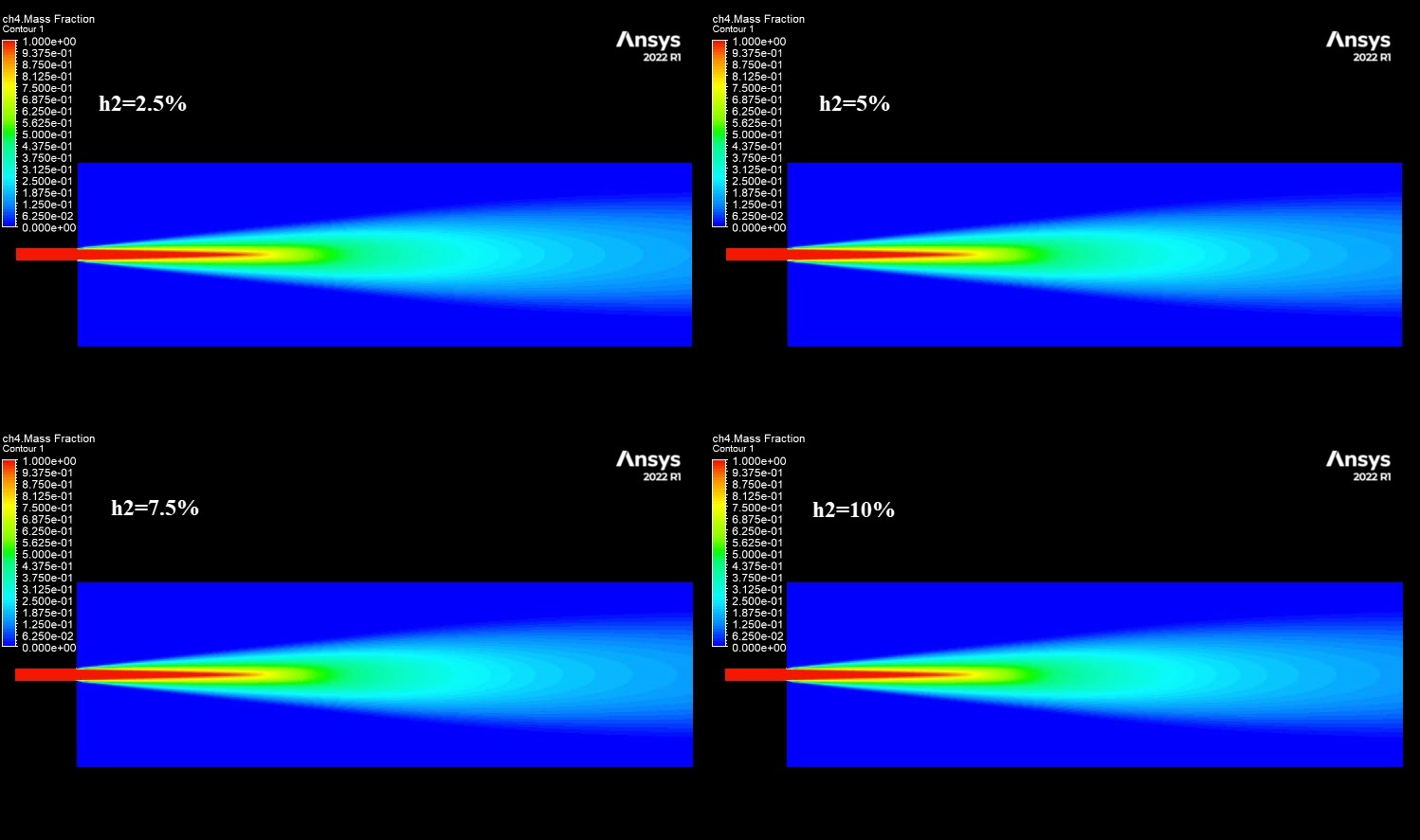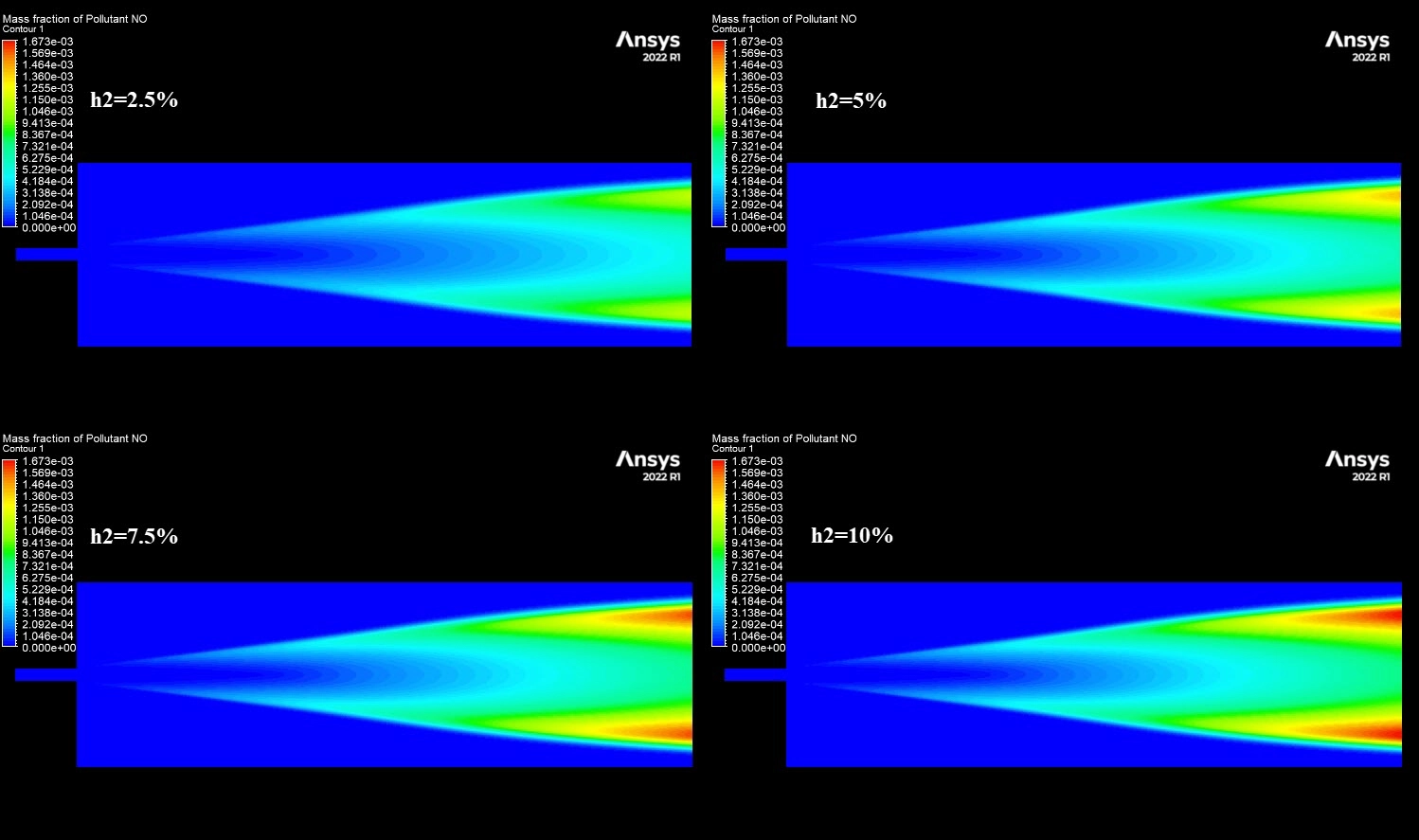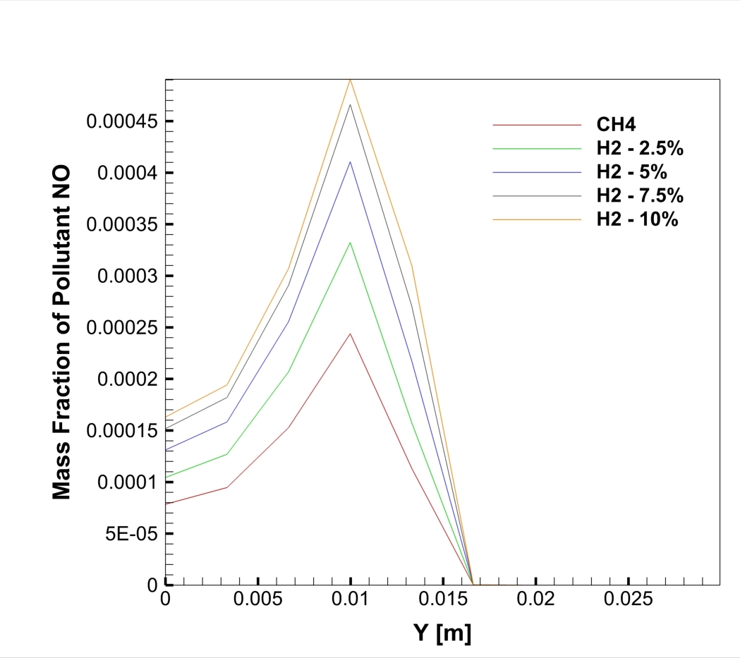 A real analysis of the simulation results, based on the specific data and contours provided, reveals a direct linear relationship between hydrogen content and pollution. The graph of NO Mass Fraction at the outlet (Figure 1) tells the main story. The red line, representing pure Methane (0% H2), shows a peak NOx concentration of roughly 240 ppm (0.00024 mass fraction). However, as we look at the orange line representing the 10% Hydrogen case, the peak concentration jumps to 480 ppm (0.00048 mass fraction). This is a massive increase; adding just 10% hydrogen effectively doubles the NOx emissions. The graph also shows that for every 2.5% of hydrogen added, the emission levels rise by approximately 50 to 60 ppm. The peak location at the mid-radius (Y = 0.01 m) identifies the “flame front,” the hottest part of the combustion zone where fuel and oxidizer meet.