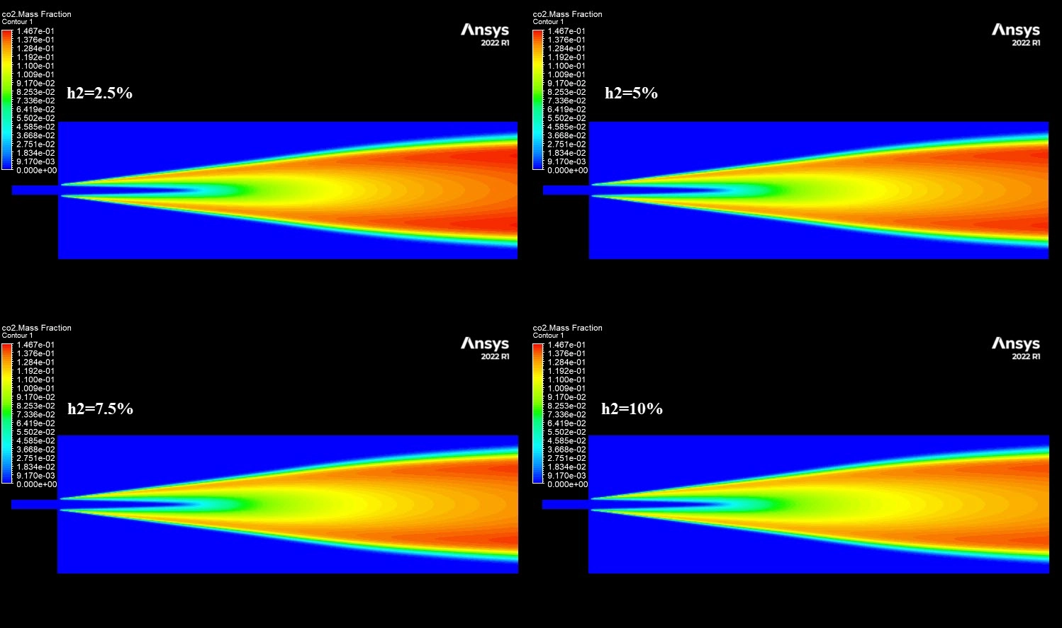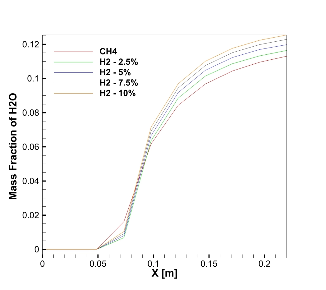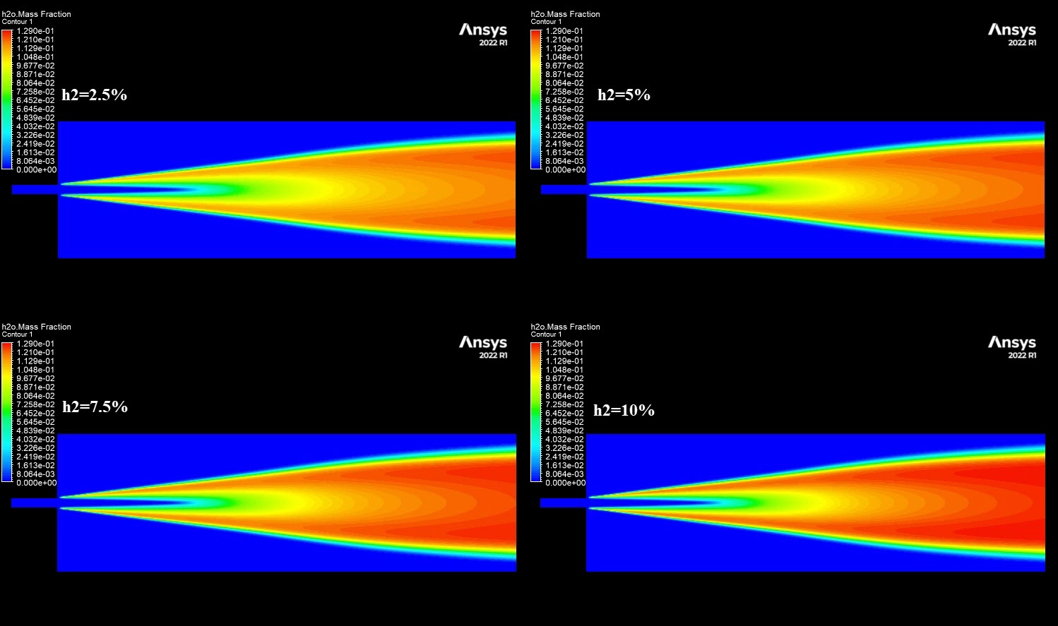 The contours in Figure 3 visually explain the physics behind these numbers. The 10% H2 case is dominated by large red zones, indicating very high local NOx concentrations reaching a maximum of 1673 ppm. The primary driver for this is the burning velocity. Hydrogen has a laminar flame speed of 2-3 m/s, which is significantly faster than Methane’s 0.4 m/s. This rapid combustion releases heat intensely and instantaneously, creating localized hot spots. Since the Zeldovich mechanism for Thermal NOx is exponentially sensitive to temperature (the reaction rate doubles for every 90 K increase), these hotter flames trigger massive NOx production. Furthermore, while the H2O contours show that hydrogen produces more water vapor (up to 0.129 mass fraction) which typically cools a flame, the sheer Heating Value of hydrogen (120 MJ/kg) overpowers this cooling effect. This CFD Analysis of Hydrogen Addition Effect on Nox Formation conclusively proves that while hydrogen reduces carbon emissions, it requires careful thermal management to prevent a spike in harmful nitrogen oxides.