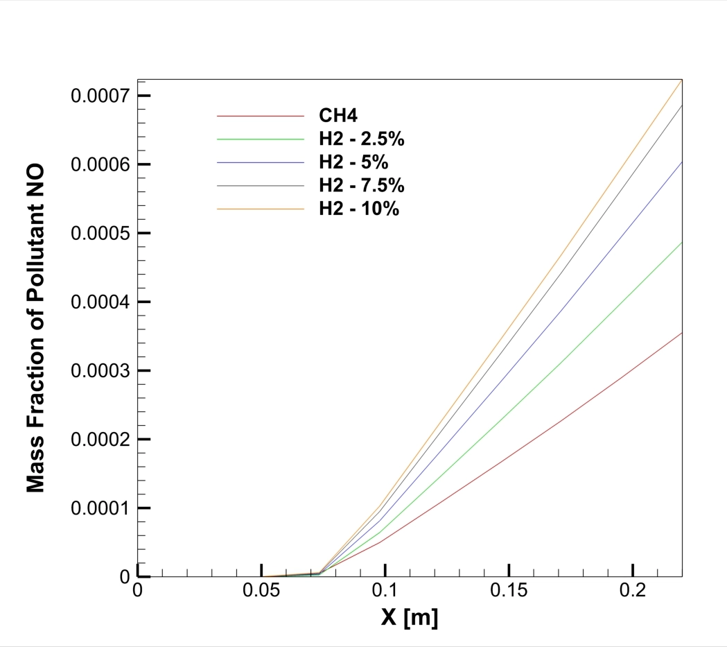 Figure 1: The NO Mass Fraction graph showing the increase in emissions as Hydrogen percentage rises.