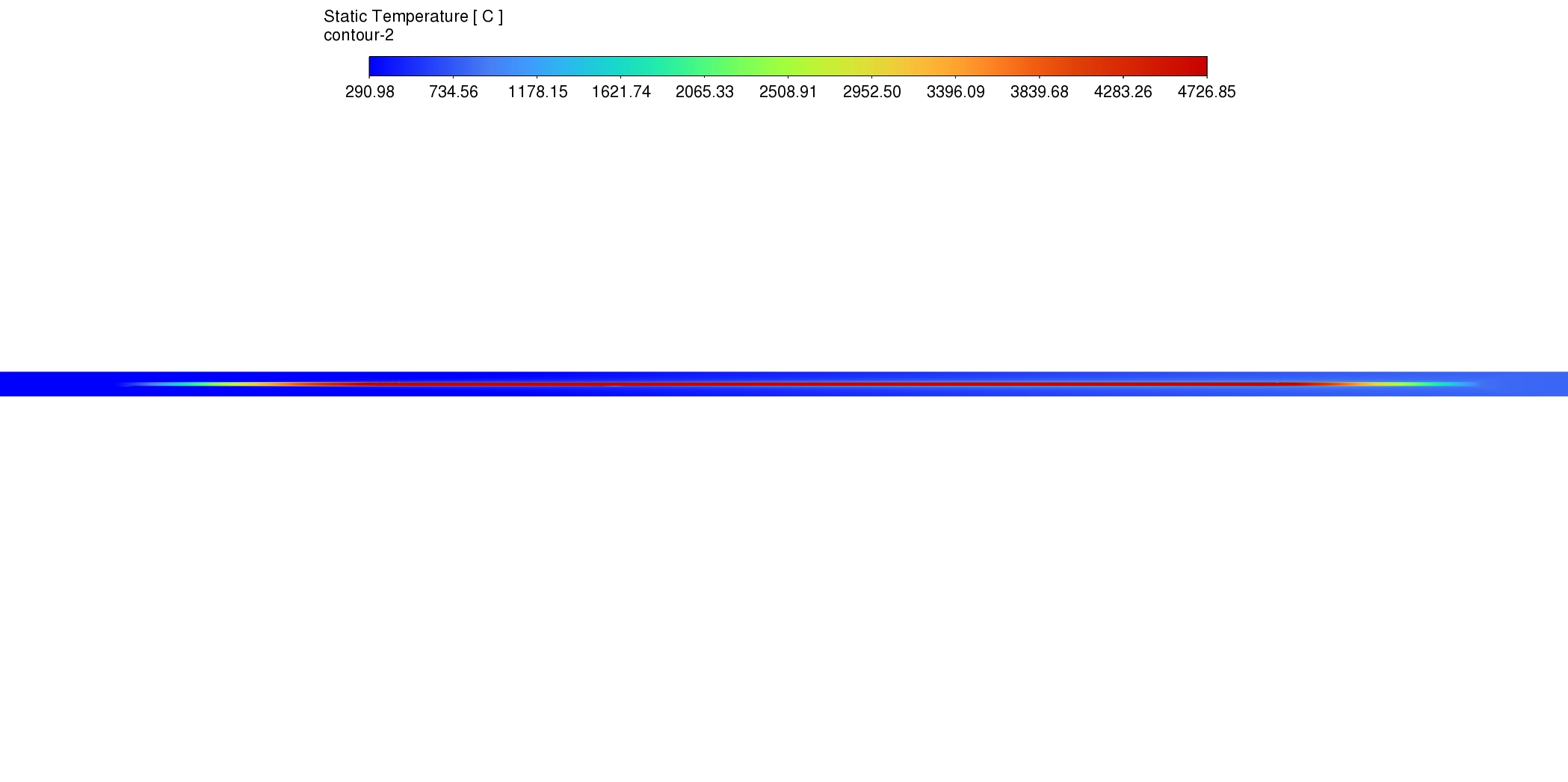 Figure 4: The static temperature contour from the CFD simulation. This shows the extreme temperature difference, from the hot fuel centerline (4726.85°C) to the much cooler water (290.98°C).