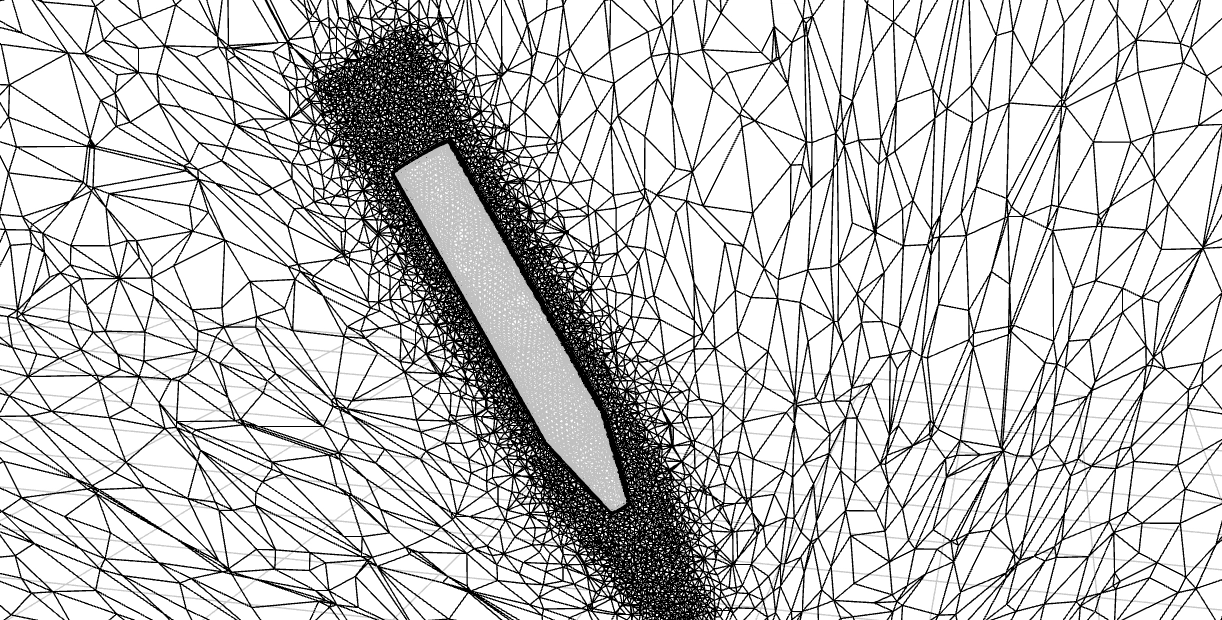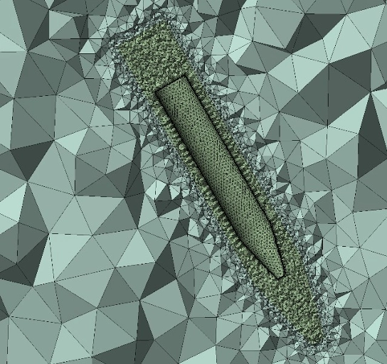 Figure 2: Detailed view of the generated grid, highlighting the fine mesh refinement required to support the 6DOF dynamic mesh deformation.
