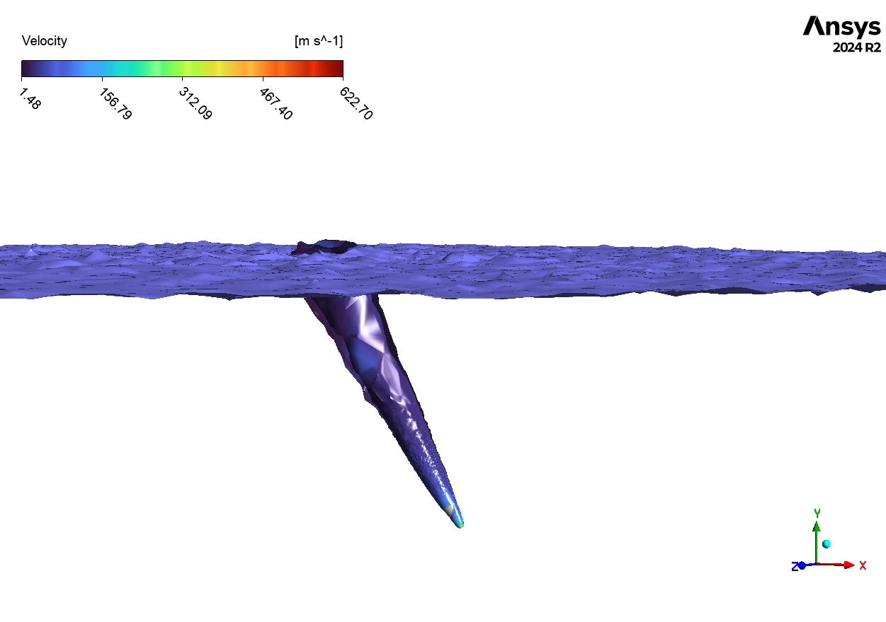 Figure 4: Velocity Magnitude Contours during impact, showing the high-speed shockwave generation and flow separation around the projectile nose.