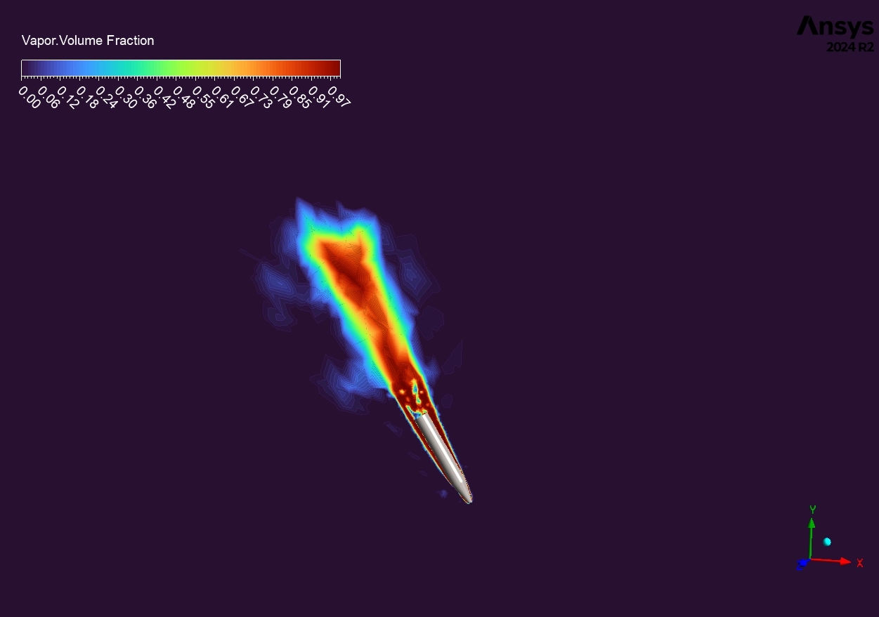 Figure 3: Vapor Volume Fraction Contourss, visualizing the asymmetric formation of the supercavity and potential instability regions.