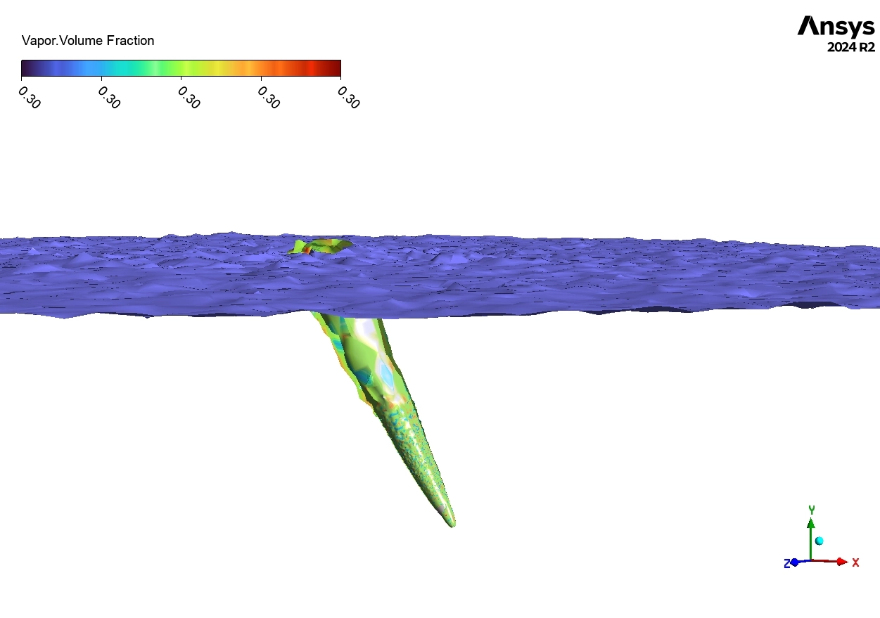 In this section, we perform a deep engineering analysis of the results to evaluate the projectile’s performance. We interpret the contours to understand the fluid dynamics of the impact. First, we analyze the Vapor Volume Fraction in Figure 3. This contour visualizes the shape of the supercavity. The Red area represents pure vapor (the cavity), while the Blue area is liquid water. From an engineering perspective, the Asymmetry of the Cavity is the most important finding in this CFD Analysis of Oblique Water Entry Supercavitation. Because the entry was oblique (angled), the cavity is thicker on the upper side than the lower side. This is critical because if the projectile tail touches the wet wall (a phenomenon called planing), it will experience a massive spike in friction. This sudden force can cause the missile to tumble or snap. The simulation confirms that at this speed, the cavity is fully developed, but the risk of tail-slap is high due to the entry angle.