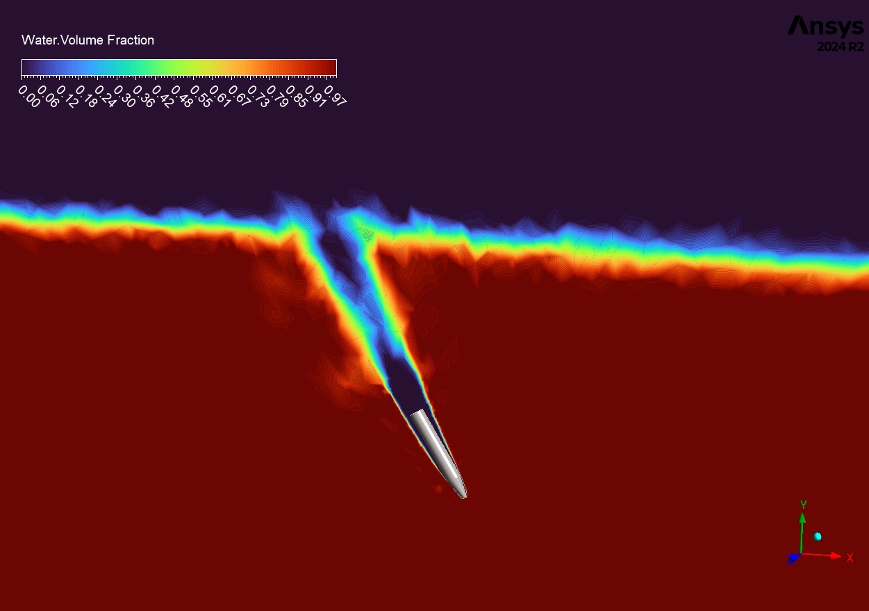 Next, we examine the Velocity Distribution in Figure 4. This contour shows the projectile entering the water, colored by velocity magnitude. The Maximum Velocity is 500 m/s. The simulation captures the massive energy transfer at the nose of the projectile. The sharp gradient between the high-speed body and the stationary water indicates a powerful Shock Wave. This shock wave propagates through the liquid, potentially damaging nearby structures. For a designer, this data is vital. It proves that the nose cone material must be extremely hard to survive the initial impact pressure. The CFD Analysis of Oblique Water Entry Supercavitation successfully predicts both the flow stability and the structural loads, providing the data needed to optimize the projectile’s shape for safer entry.