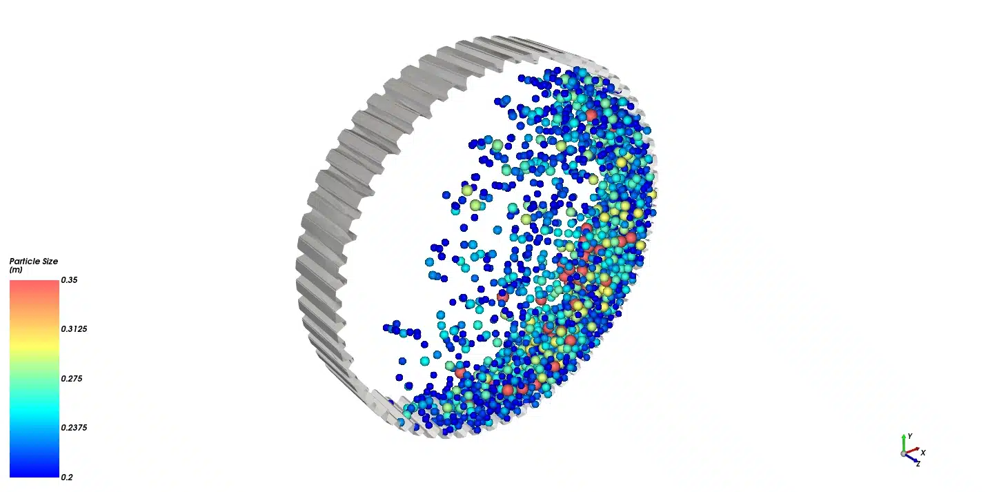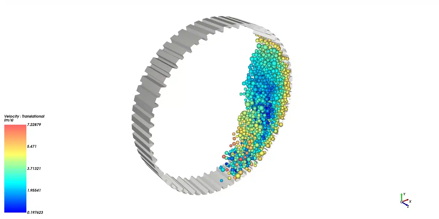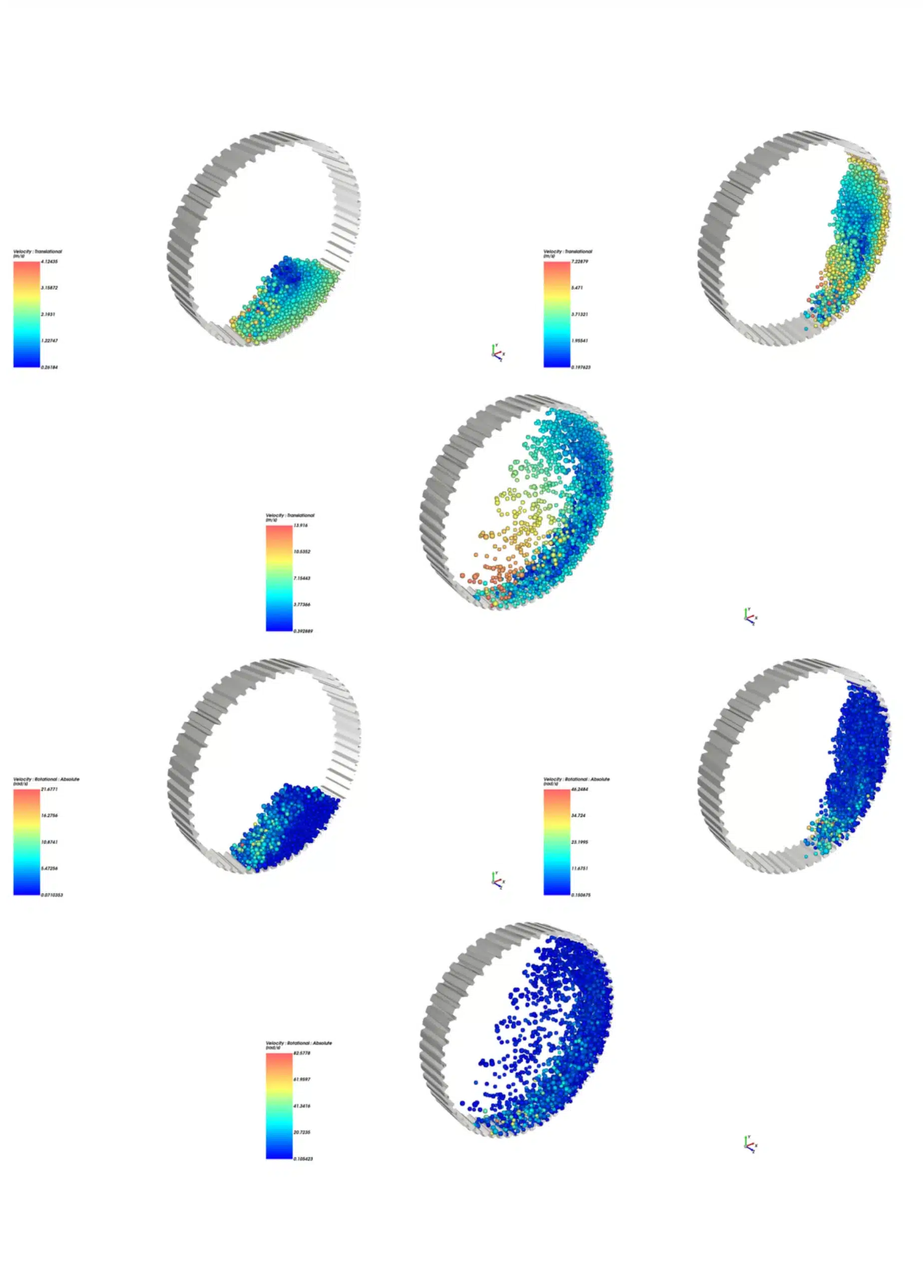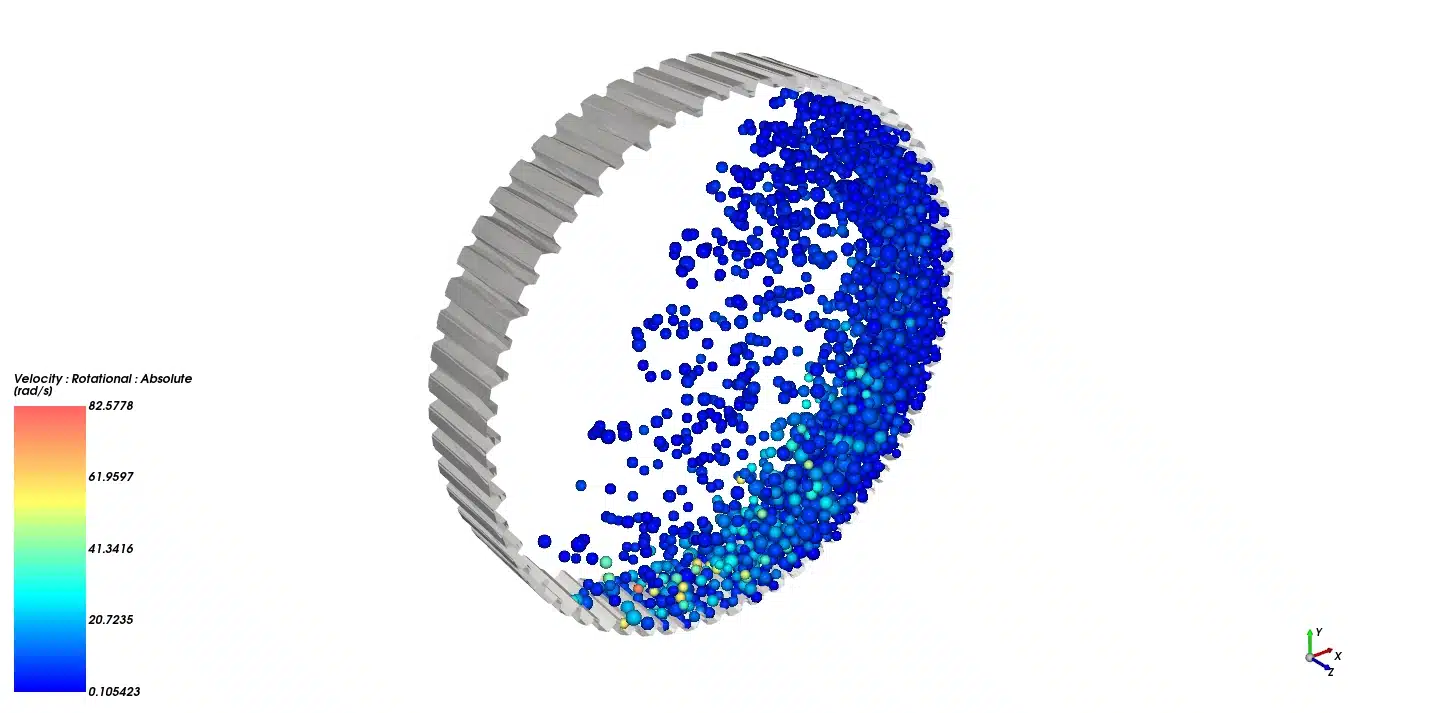 To simulate the physical rotation, we applied specific kinematic boundary conditions. We set the computational drum to accelerate gently at 0.35 rad/s² until it reached a constant, steady operating speed of exactly 1.2 rad/s (11.5 RPM). To calculate the exact metal damage during this rotation, we activated advanced mathematical wear equations. The numerical solver then carefully tracked the violent collisions of these particles over a total physical time of exactly 25 seconds.