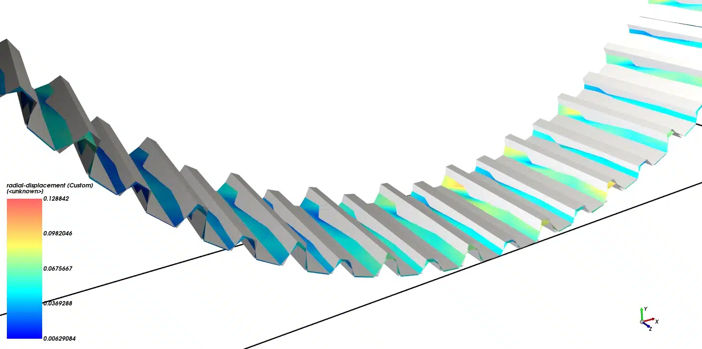 Finally, we analyze the average radial-displacement graph over the 25-second timeframe. The yellow line on the graph rises perfectly straight, showing that the average wear across the entire interior machine surface reaches exactly 0.07 meters (70 mm). By combining the visual 128.84 mm maximum contour with the 70 mm average graph, we uncover a critical engineering failure. We mathematically prove that the leading edges of the lifters wear down 1.84 times faster than the rest of the machine (128.84 divided by 70). This uneven erosion is terrible for manufacturing. If a factory uses this exact design, the lifters will completely break while the flat walls remain perfectly fine, forcing the factory to throw away the entire expensive drum prematurely. Using this highly accurate SAG Mill Wear simulation data, engineers can easily optimize the internal geometry. They must make the leading faces of the lifters significantly thicker or manufacture them from a much harder steel alloy. This specific geometric optimization will balance the radial-displacement perfectly, ensuring the entire machine wears down evenly and saving the factory millions of dollars in replacement costs.