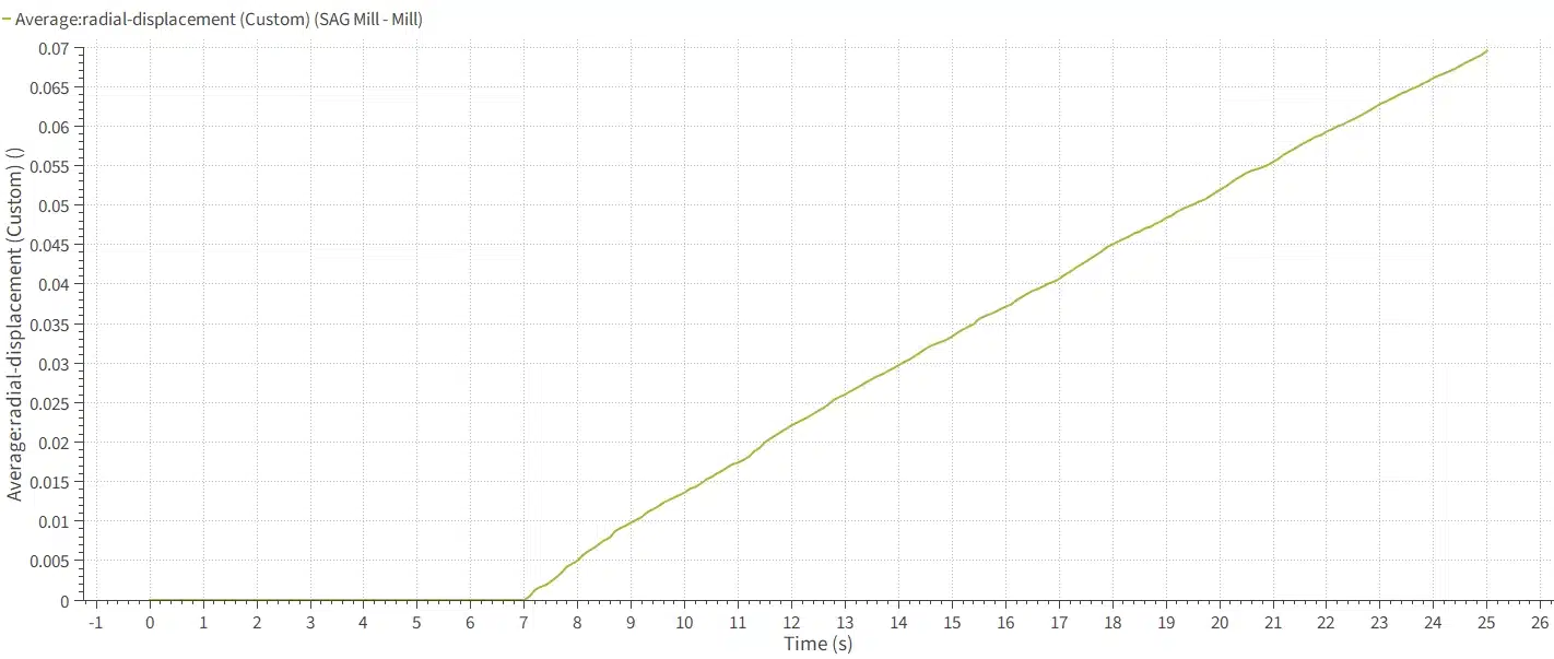 Figure 6: Average radial displacement progression from ROCKY DEM SAG mill erosion simulation, linear increase from 0 to 70 mm over 25 seconds