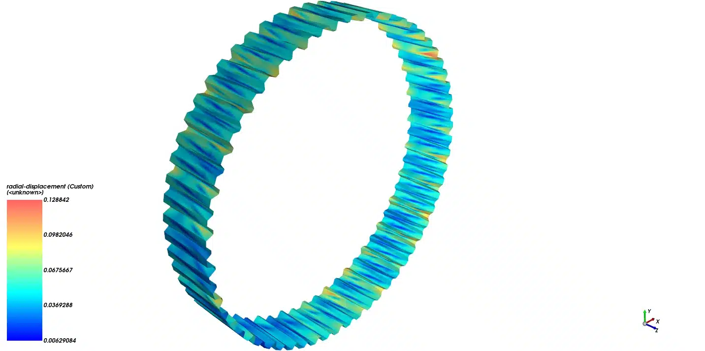 Figure 5: Radial-displacement erosion contour highlighting the extreme 128.84 mm damage hotspots strictly on the leading faces of the lifters.