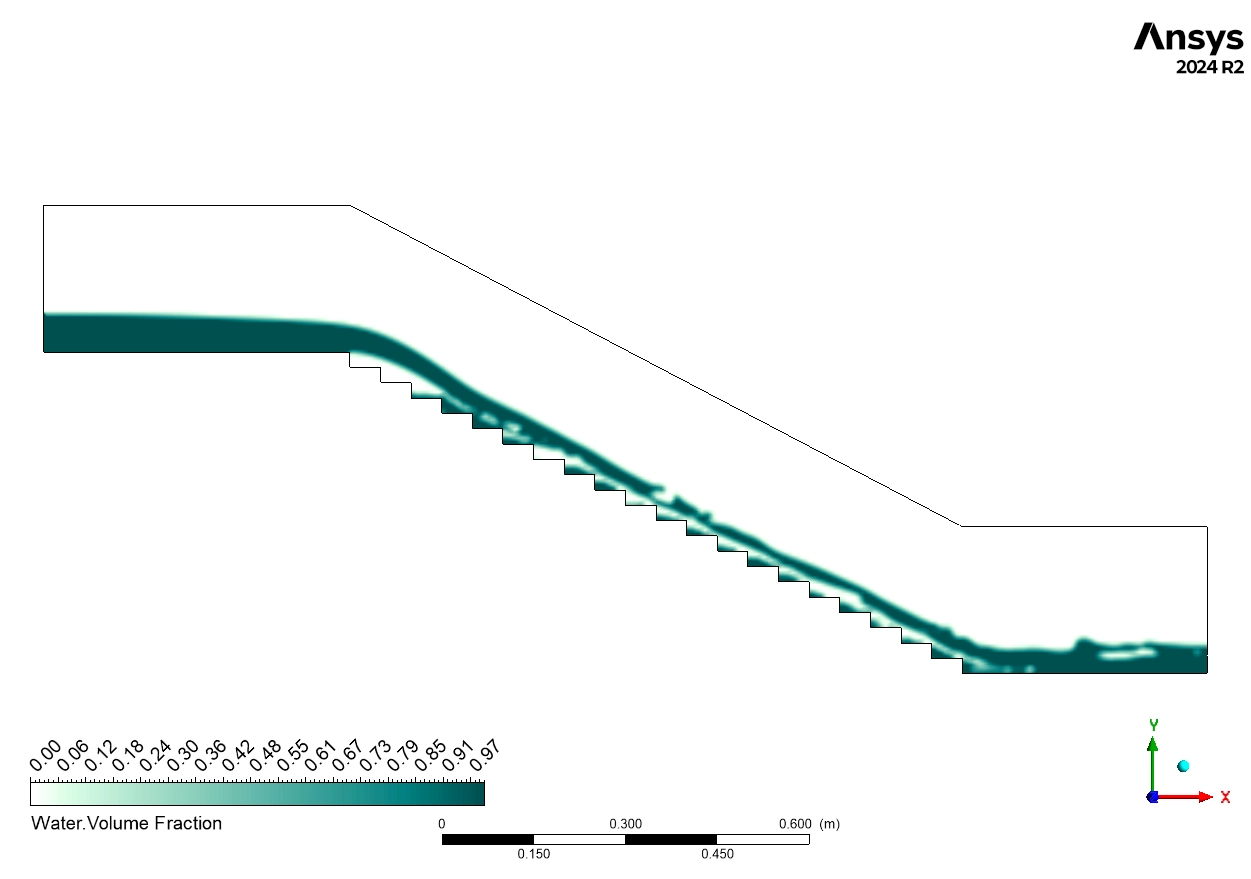 The water volume fraction contours in Figure 3 show the overall flow structure. The water travels down the spillway in what is known as a “skimming flow” regime. This means the main body of water flows over the tips of the steps. In the cavity between each step, a stable, re-circulating vortex of water is formed. These trapped vortices are not a problem; they are the primary mechanism for energy dissipation. The constant churning of these vortices acts like a brake, converting the water’s high kinetic energy into heat and turbulence, which is much less damaging to the structure. The model also shows how the water surface remains quite smooth, with very little air getting mixed in, indicating stable and non-chaotic flow.