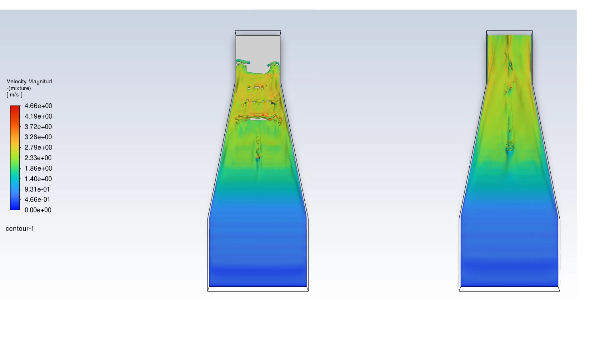 The velocity contours in Figure 4 provide the data to support these observations. The analysis shows that the water velocity gradually increases as it moves down the spillway, which is expected due to gravity. The converging walls of the spillway squeeze the flow, causing it to accelerate further towards the outlet, reaching a maximum velocity of approximately 5.69 m/s. This value is a critical engineering output. It tells designers the final speed of the water as it enters the downstream river channel, allowing them to design proper erosion protection. The velocity contours also clearly show the low-speed recirculation zones behind each step, confirming the energy dissipation mechanism seen in the volume fraction contours.