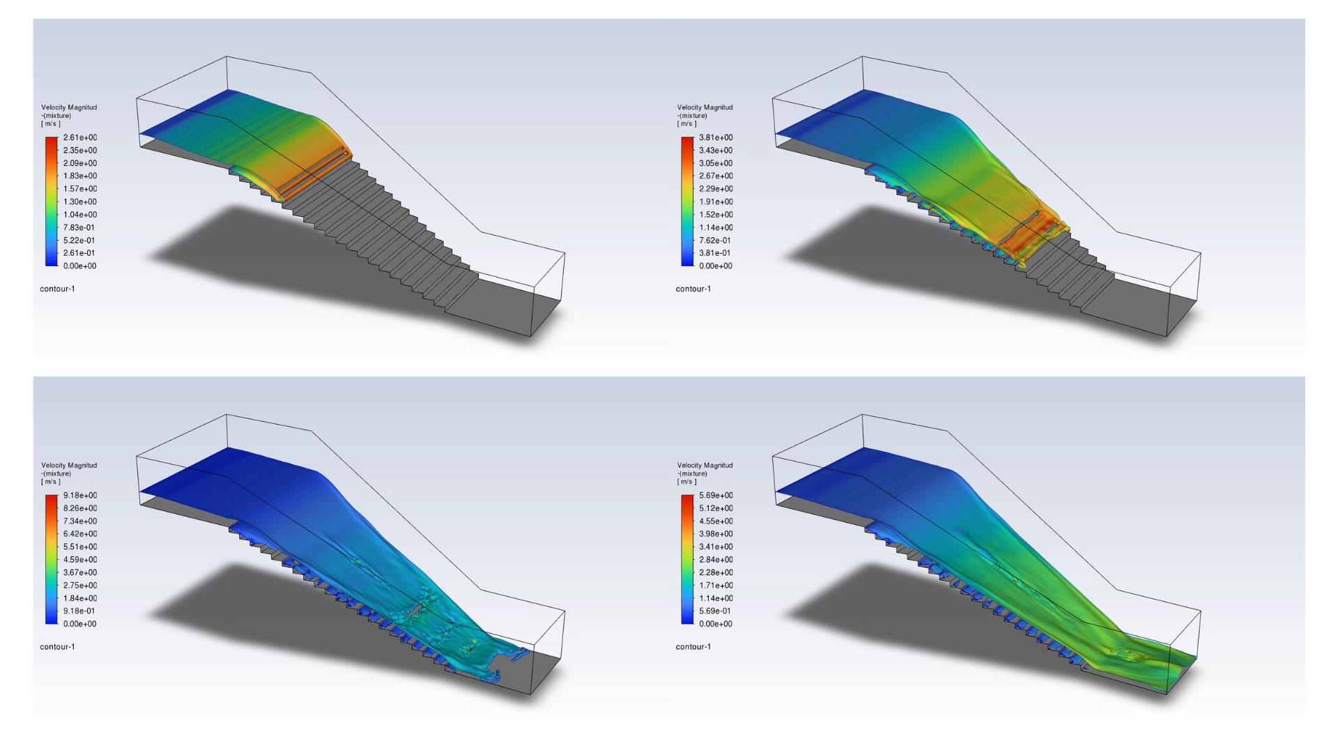 The simulation results provide a clear and detailed engineering analysis of the spillway’s hydraulic performance, showing exactly how the design elements work together to control the water flow.