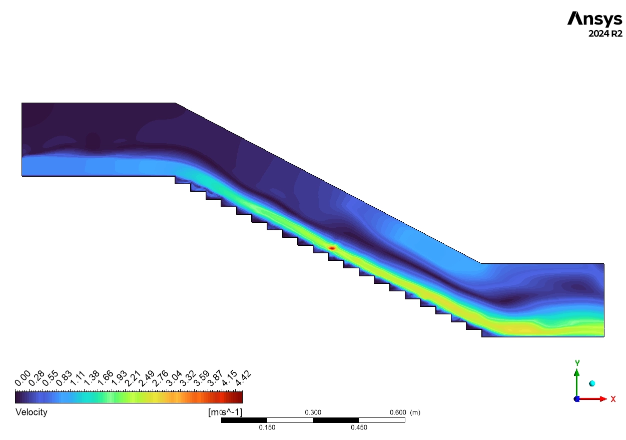 The most important achievement of this simulation is the successful quantification of the spillway’s energy dissipation performance. By accurately modeling the skimming flow and the stable vortices behind each step, the Stepped Spillway CFD model proves that the design effectively and safely reduces the water’s energy. The prediction of a controlled maximum exit velocity of 5.69 m/s validates that the spillway can handle the design flow rate without causing downstream erosion, ensuring the long-term safety of the entire dam structure.